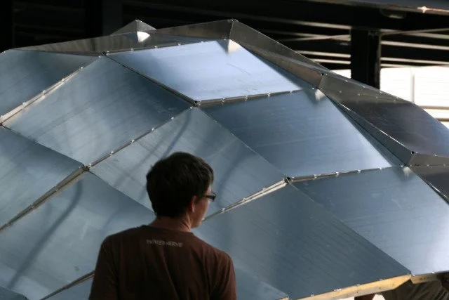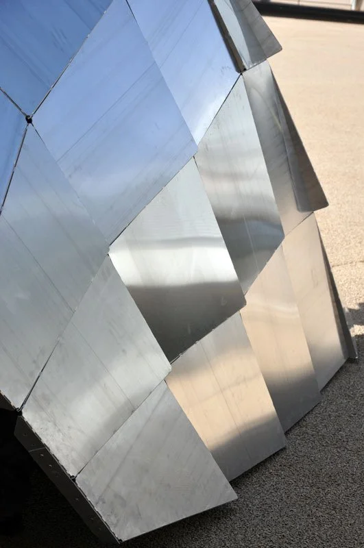 The result is a self-standing dome built as an assembly of fifty sheets of hand folded aluminum sheets (1x1m) cut over a weekend workshop.