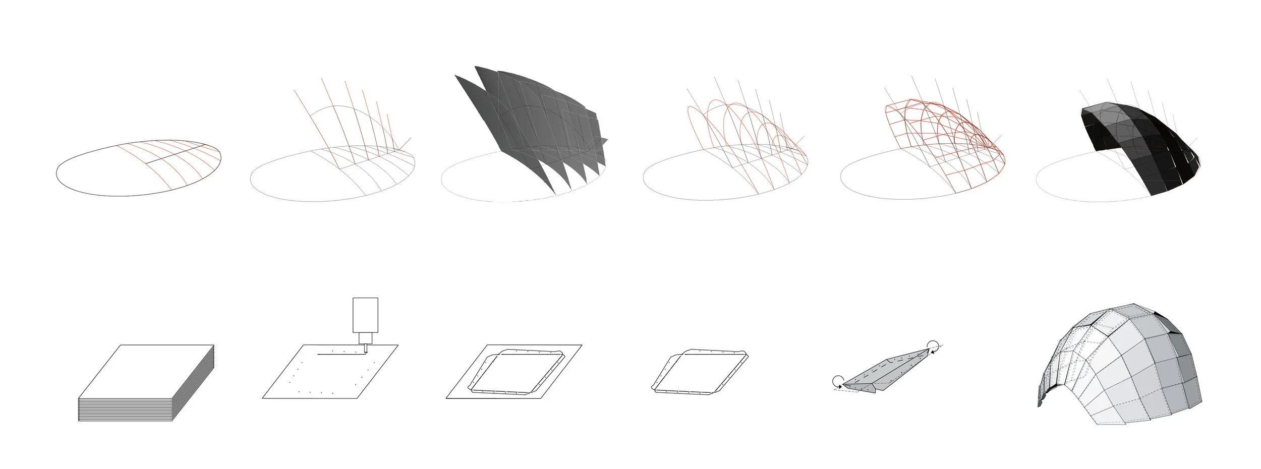 This dome has to be understood as the demonstration of this consistent work- flow setup between design and fabrication. The design has gone through quick design iterations for five days, constantly evolving through fabrication models replicating the connection details driven by the project’s constraints.