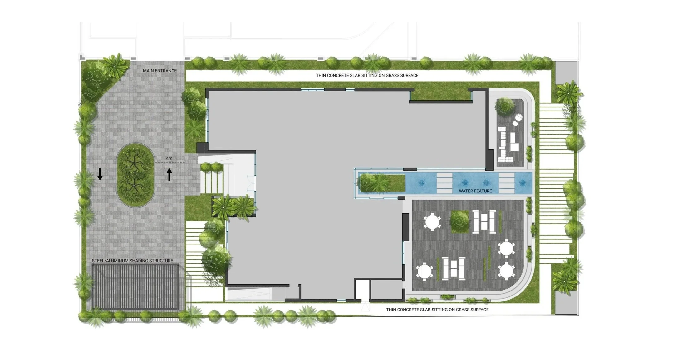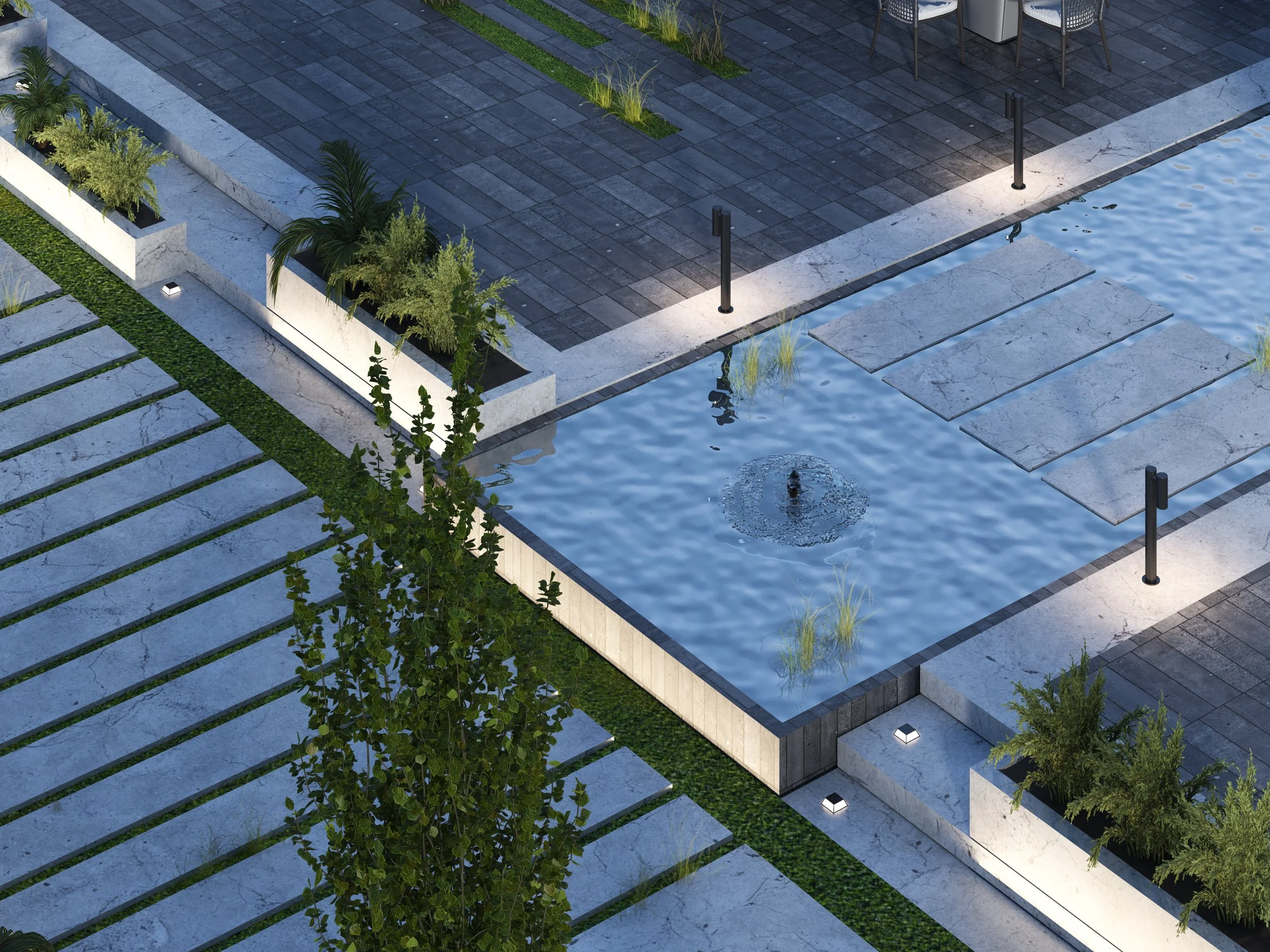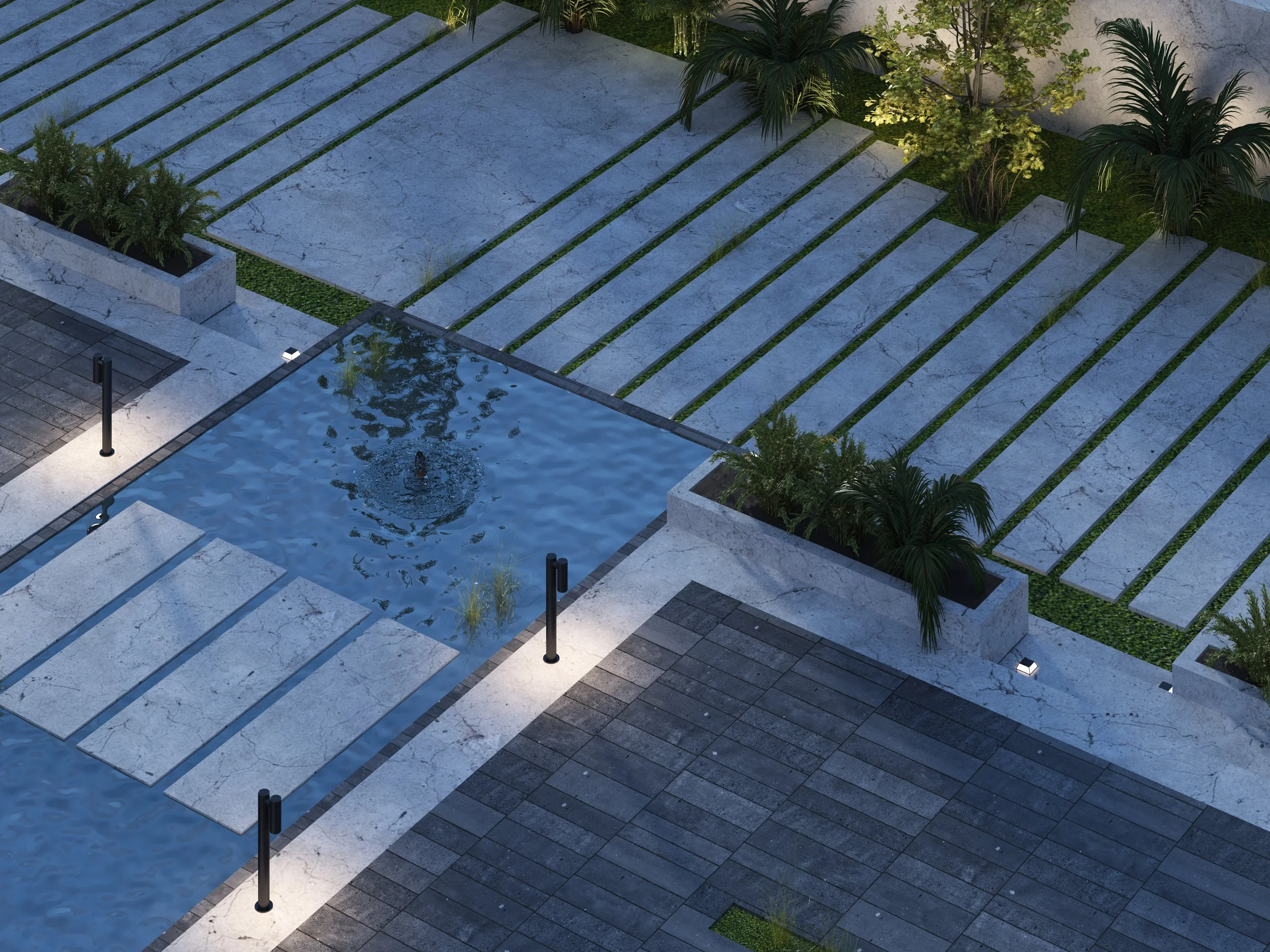 The materiality of the project added warmth and contrast with the selection of vegetation. The greenery in fact, consisted of a selection of local plants and trees that could grow and blossom in the climate of Abu Dhabi. Details in the landscape design were crafted to highlight specific features like the water pond, the pedestrian pathways as well as the occupation of grass and greenery within the space.