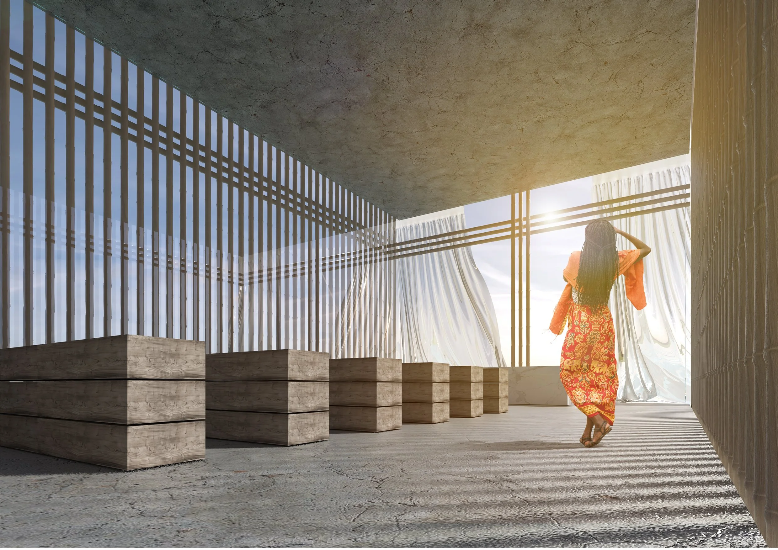 The materiality is precise and purposeful. Bamboo forms the structural façade, honest and native to the landscape. Concrete grounds the intervention, its weight and permanence in quiet dialogue with the lightness of the bamboo above. Curtains move with the wind, softening the boundary between inside and outside until it almost disappears.