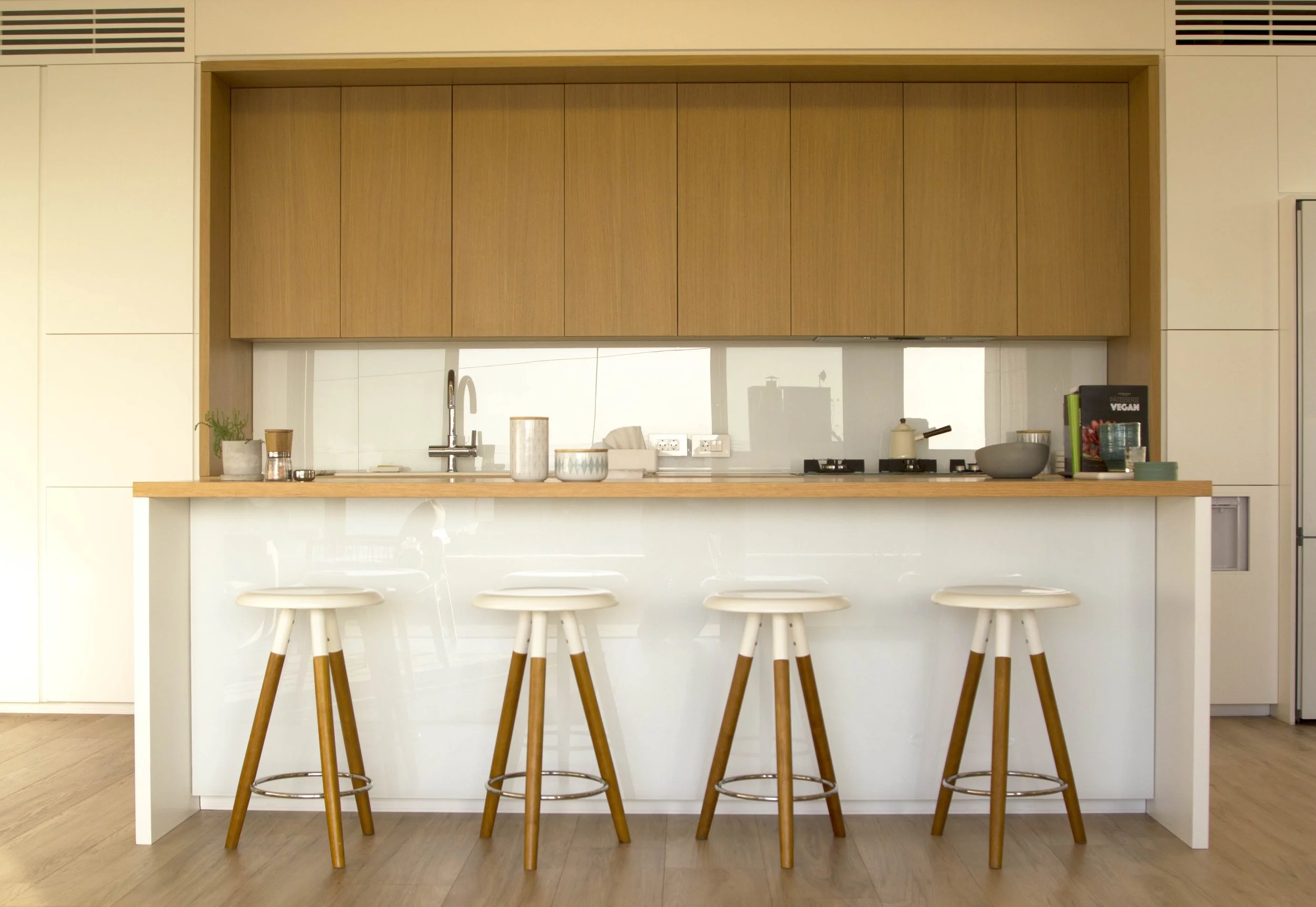 The design is organised around a bright, open kitchen that anchors the living spaces and invites a natural flow between cooking, dining, and gathering. Warm tones run throughout, softened by natural materials: wood, stone, and textiles that give each room a sense of weight and comfort without closing it in.