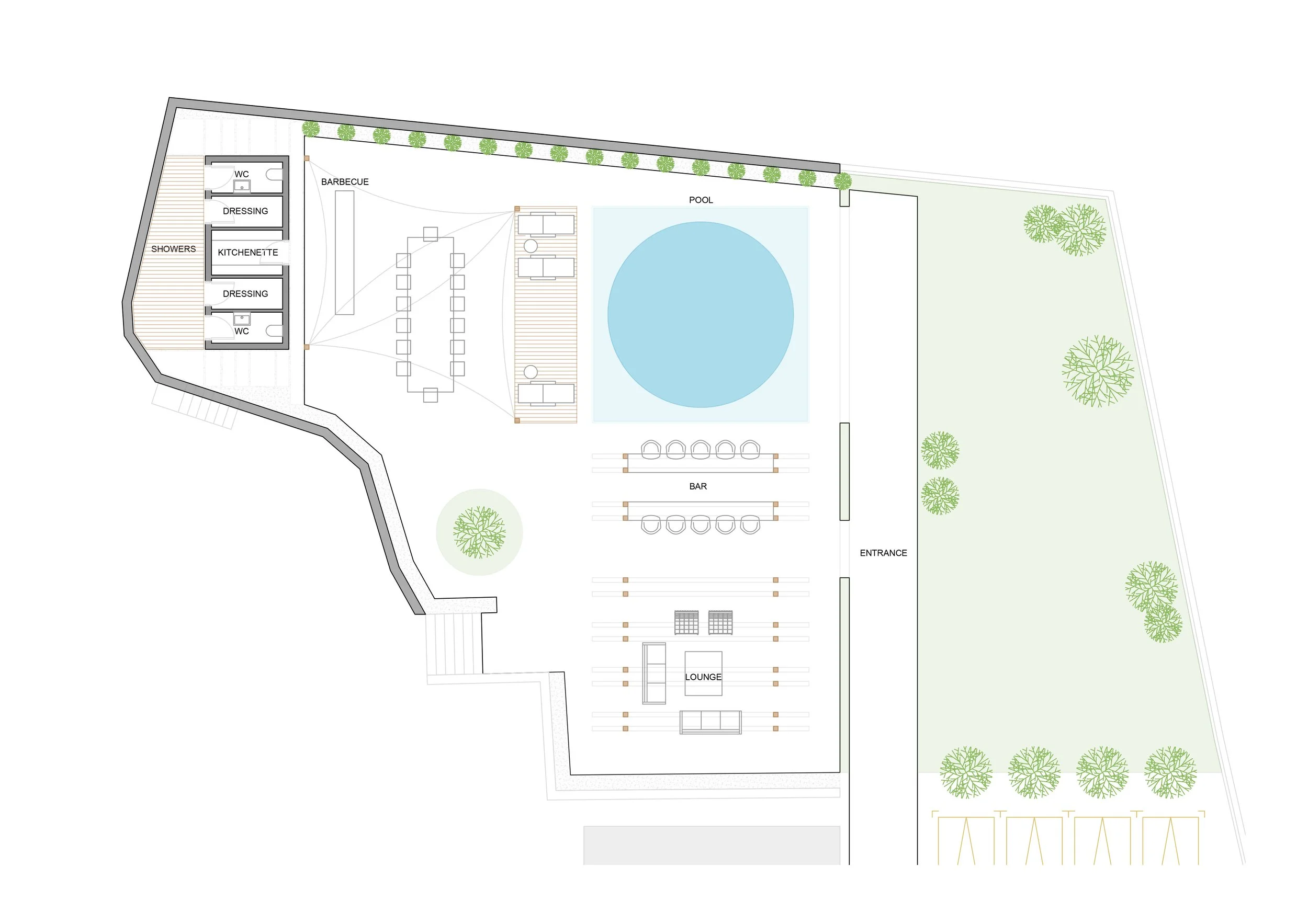 From this platform, a shaded lounge emerges, its roof carried by a rhythm of wooden columns that filter the light and define a space between inside and outside. A circular pool anchors the composition, offering relief from the heat and a quiet focal point that draws the eye inward before the view pulls it back out toward the mountain.