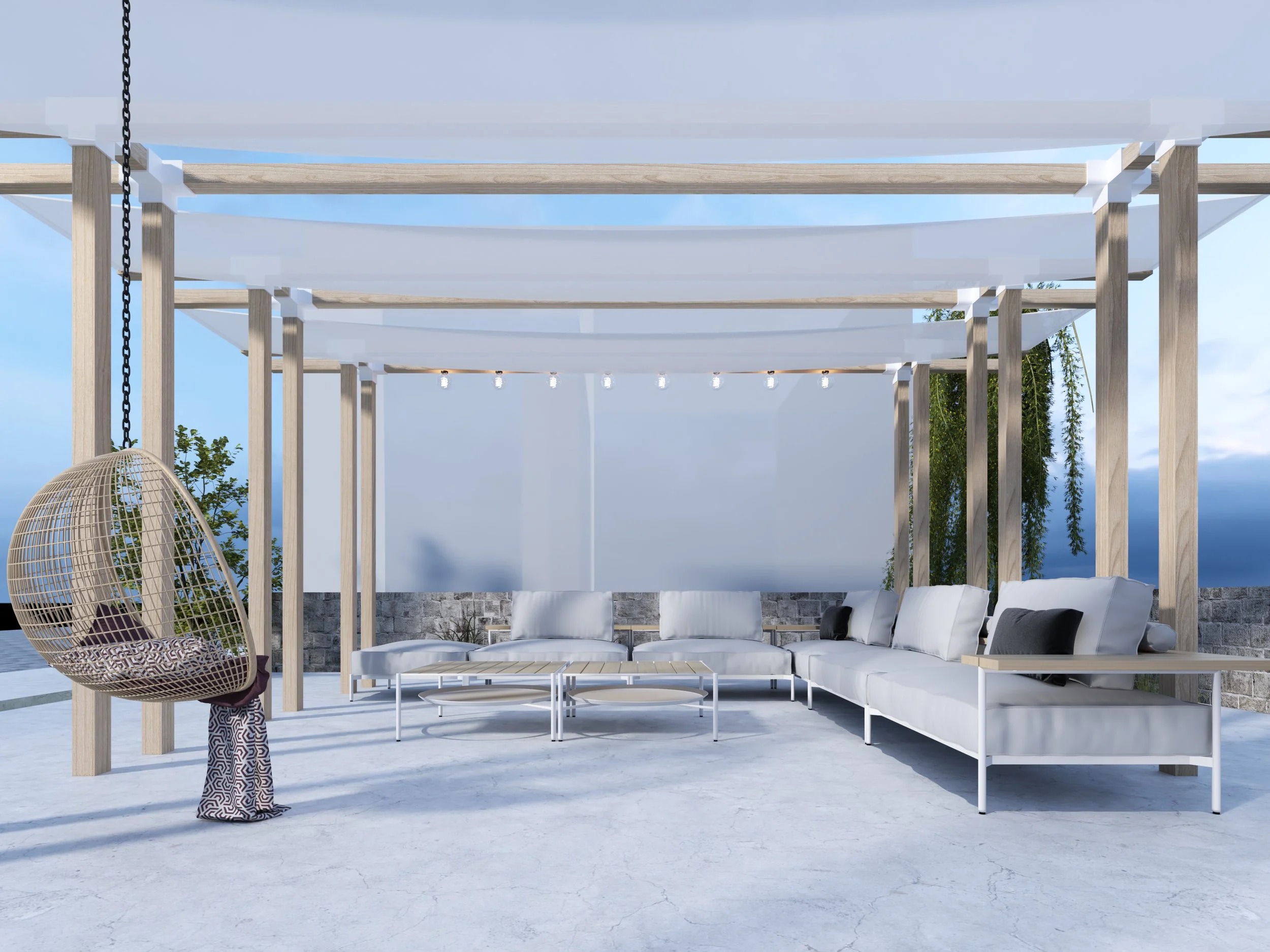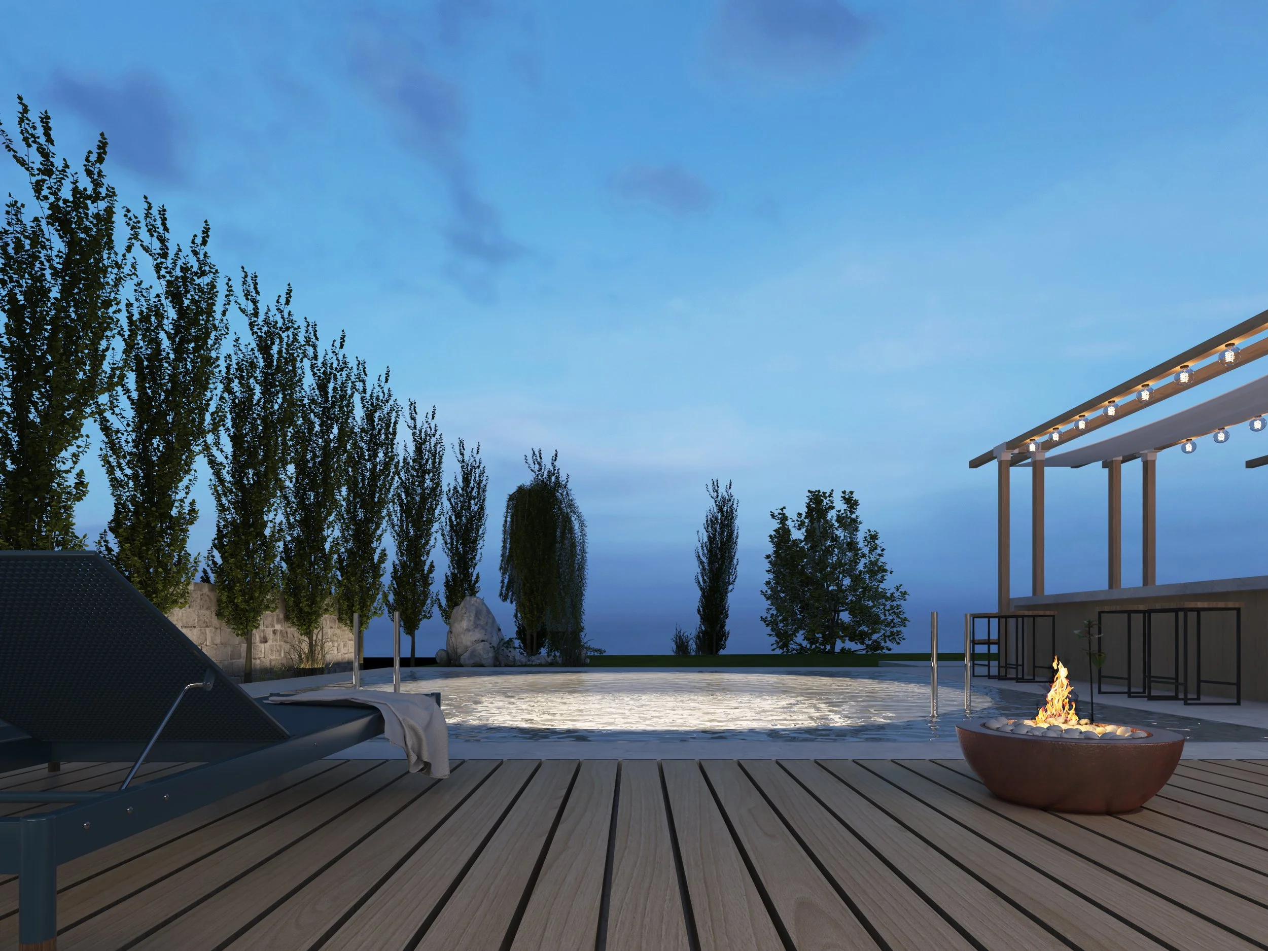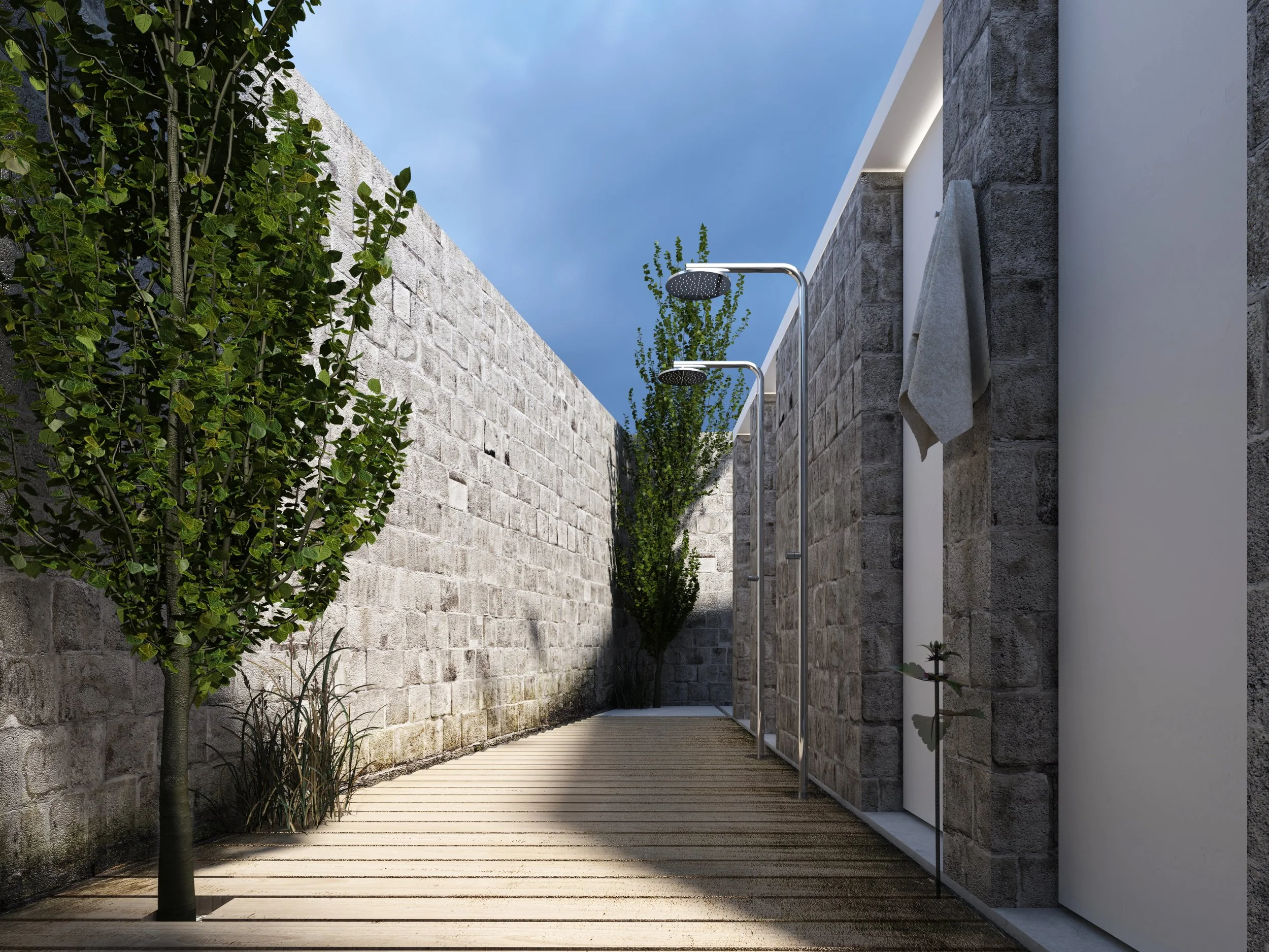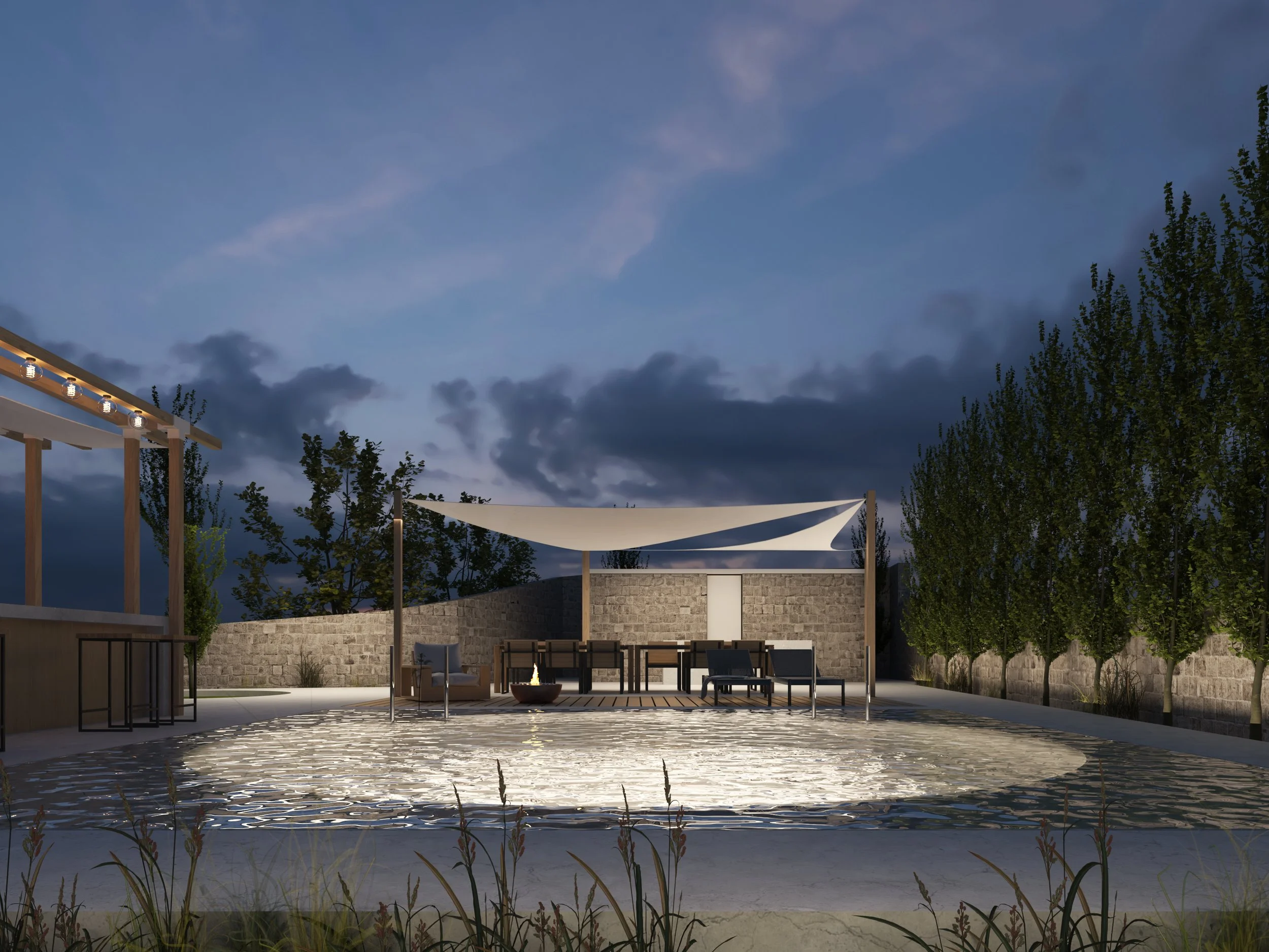 The climate here is demanding. Summers are dry and hot, the sun relentless, the outdoor space vast and exposed. The design responds to this directly. A neat white platform was carefully placed on the site, an intervention precise enough to feel inevitable, woven into the existing house without disturbing it.